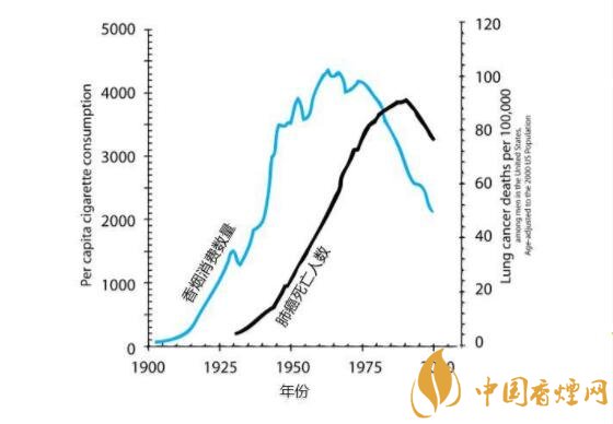 大家一看這個圖,就會發現吸煙數量和肺癌死亡數量的曲線幾乎一模一樣,但有大約25年的滯后:吸煙增加,肺癌會在25年后相應增加,吸煙減少,肺癌也會在25年后相應減少。這個奇特的滯后主要是因為肺癌發生是個非常慢的過程,從癌前變異,到早期癌癥,到晚期癌癥,一般需要10~20年時間。