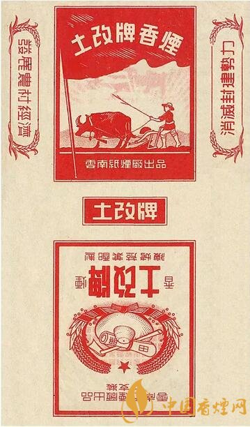 1951~1952年云南紙煙廠出品。主圖為農民駕耕牛犁田,副圖為草帽鋤頭麥穗圍成紅色圖案,“發展農村經濟、消滅封建勢力”字樣,表現農民第一次成為土地的主人,在田間精心勞作形象。1950年云南和平解放,1951年開展大規模的土地改革運動。該煙標是中國煙標史上少見的“土改”牌煙標。