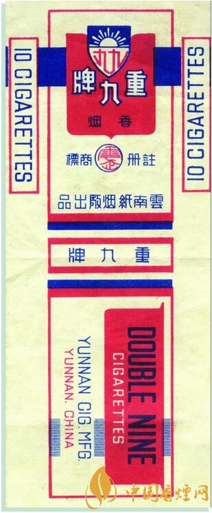 1945年,云南紙煙廠出品。創牌于1922年,為紀念護國名將蔡鍔等所領導的“重九起義”而創牌,重九牌歷史悠久,具有豐富的文化內涵,是云南紙煙廠的榮譽產品。該牌號卷煙僅生產13.85箱,屬罕見珍貴煙標,具有歷史文物價值。1945年6月1日云南紙煙廠在昆明金碧日報刊登“重九”牌更換商標紙盒啟示 , 以此啟示為證改寫了此枚珍貴歷史商標的確切生產時間。