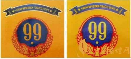 真品卷煙:1.商標LOGO稻穗圖案凸起,整體立體、飽滿,大豐收。2.99數字筆畫圓潤、飽滿,下面圓點尤為突出。3. 藍色底紋顏色重,邊緣向中間色彩過渡自然。4.商標紙流水紋路清晰可見。