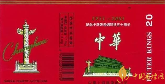 1.二十一世紀:2001年,為紀念中華牌卷煙問世五十周年,金色的“1951-2001”年號非常顯眼,特制(20支全開式硬卡)這也是全開式中華首次問世。