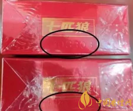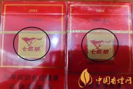 1、商標紙上的“七匹狼”商標圖案:真煙套印準確,燙金飽滿,色澤鮮亮,圖案生動,立體感強。假煙燙金套印容易出現錯位,燙金處會出現漏金現象,顏色相較真煙暗沉,立體感差。(左真右假)