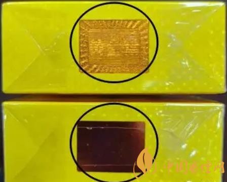 3、煙盒頂部防偽標識:真煙在不同角度可見黃金葉文字與圖案相互變換。假煙未能顯現真煙防偽標識的效果,或者文字與圖案層疊無法清晰分離。(上真下假)