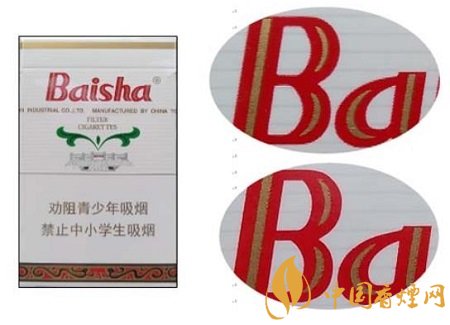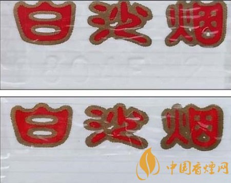 真品卷煙:背面Baisha拼音字母凹印,紅色與白色交界位置呈現模糊不清晰的鋸齒痕跡。(上真下假)