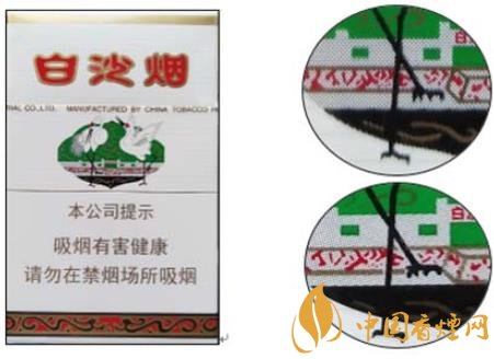 白沙(硬)因江南名泉式 ---“白沙古井”而得名,包裝以“白沙古井” 為背景,象征吉祥如意的雙鶴圖形為主體圖案。產品不斷應用新技術,科學配方,合理配香配料,口味特點:煙香濃馥、諧調,余味純正舒適。現就該卷煙小盒鑒別方法介紹如下: