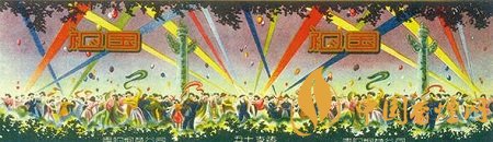 而貴陽煙草公司出品于上世紀50年代的“祖國”煙標(圖4),主版采用明快色調,描繪出了新中國成立后人民當家作主的喜悅之情:只見各族人民身著節日盛裝,在彩球飄飄、五顏六色的射燈光柱直射天空背景襯托下,聚集于天安門前的華表周圍,在撼天動地的鼓樂聲中載歌載舞,盡情地歡慶新中國的誕生。