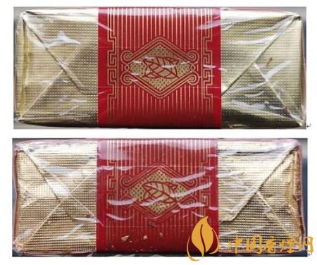 假冒卷煙:1.透明紙燙封收縮雜亂、死板,水汽較重。2.商標紙拐角折疊緊實,無空隙。(上真下假)