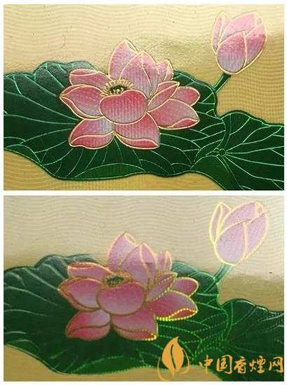 真品卷煙商標紙上的荷花花瓣采用漸變技術,顏色由粉紅色向白色過渡,花蕊處金色線條清晰,圖案印刷自然協調,立體感強;假煙采用普通仿制技術,顏色搭配較為死板,花蕊處金色線條模糊、擠成一團,圖案印刷粗糙、立體感差。