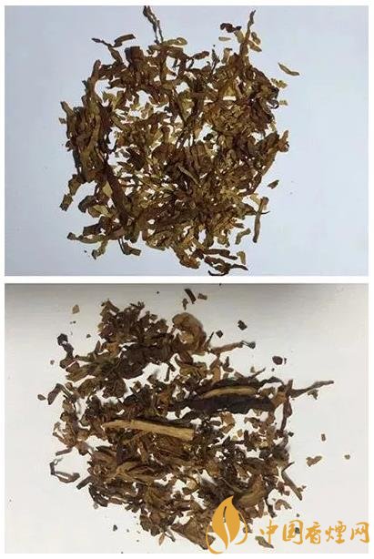 真品卷煙煙絲呈金黃色、絲條狀,煙絲結構為純葉絲,香氣醇厚;假煙煙絲呈棕黑色,含末量大,煙梗較多,香精氣味濃烈。