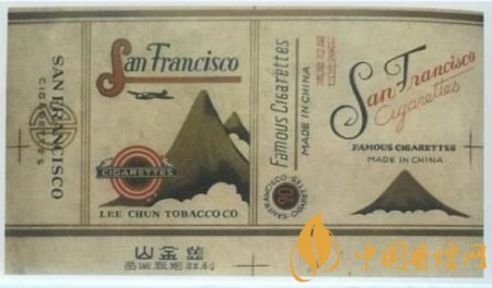 上世紀三十年代,由利群煙廠出品的“舊金山”牌卷煙,為橫版。煙標上由紅色大寫英文字母“S”帶出的“San Francisco”品名,舞動感十足。其下兩座金山上,一架飛機翔過,山腳旁畫有三個重疊的紅色圓圈,一圈一圈又一圈,像極了煙蒂的火苗生生不息,在此中間寫有“CIGARETTES”,別出心裁地交代了“舊金山”牌卷煙的品質和規格。副版的文字多于圖案,草寫的英文煙標,重復豎寫橫寫的“Famous cigarette”,左上角“注意封口、謹防假冒”八個中文字的提示,卻很醒目。當時的煙標設計,以提示的文字顯現,確不多見。整張煙標幾乎鋪滿了“舊金山”牌卷煙所要表達的內容。