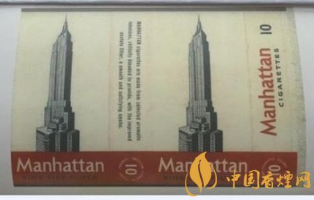 上世紀四十年代,美國煙公司出品了“曼哈頓”牌香煙,為10支裝規格。正版與副版均畫有曼哈頓的標注性建筑——帝國大廈。帝國大廈建于1931年4月,是紐約的地標建筑物之一。它高381米,共有103層。它是一座多功能寫字樓,也是旅游景點。上世紀四十年代,帝國大廈是全球最高的大廈,后被世貿雙子塔取代。世貿雙子塔被毀后,帝國大廈重又成為最高大廈。煙標底部紅色實心框內,寫有粗體英文“Manhattan”煙標名稱,騎縫處寫有三行曼哈頓香煙的產品介紹。整張煙標,巍峨雄偉的銀灰色帝國大廈,在正副版上遙相呼應,嘆為觀止。