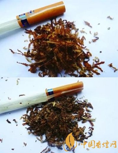 真品煙絲以精選國(guó)內(nèi)外自然醇化兩年以上的優(yōu)質(zhì)烤煙為原料,切絲均勻一致,顏色均為金黃色,葉絲比例高;假煙煙絲多為劣質(zhì)煙葉經(jīng)過(guò)化學(xué)藥劑催化加染加工而成,煙絲表面多存留一些白色香精粉末,煙絲顏色多為褐色,與真品特征存在明顯差異。(上真下假)