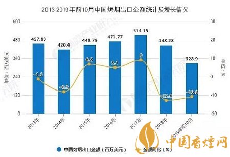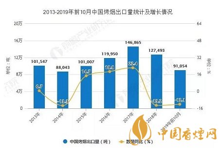 2019年前10月中國烤煙出口量突破9萬噸。據(jù)中國海關總署數(shù)據(jù)顯示,2019年10月中國烤煙出口量為6128噸。累計方面,2019年1-10月中國烤煙出口量達到91054噸,同比下降12.1%。