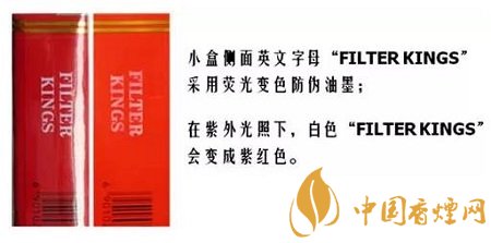 光變防偽涂層——小包側面“FILTER KINGS”字樣,經陽光直射或紫外光照射后由白色變成紫紅色,停止照射后,紫紅色會逐漸消退。
