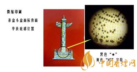 5、用放大鏡查看條盒小盒商標背面華表底部位置,可以看到黑色“★”、黃色“YC”字母。