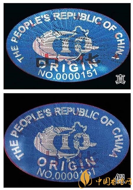 4、“中華”原產地標志為藍色橢圓形,折光可見“中華”字樣、8顆“★”及天安門圖案。真煙色彩飽滿,圖案清晰;假煙色彩暗淡,圖案模糊。
