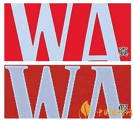 6、真煙白色字體邊緣規整光滑,字跡飽滿;假煙白色字體邊緣粗糙,色彩污濁,有明顯鋸齒印。