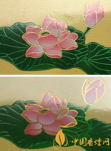 真品卷煙商標(biāo)紙上的荷花花瓣采用漸變技術(shù),顏色由粉紅色向白色過渡,花蕊處金色線條清晰,圖案印刷自然協(xié)調(diào),立體感強;假煙采用普通仿制技術(shù),顏色搭配較為死板,花蕊處金色線條模糊、擠成一團,圖案印刷粗糙、立體感差。