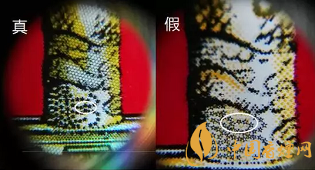 鑒別真假“中華”的關鍵在于用放大鏡查看條包兩端中英文字母的邊緣有無放射鋸齒,真“中華”的字體在放大后邊緣依然很規整,無鋸齒。假“中華”卷煙的字體在用20倍放大鏡觀察邊緣呈明顯的鋸齒狀。