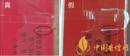 “中華”原產地標志為藍色橢圓形,折光可見“中華”字樣、8顆“★”及天安門圖案。真煙色彩飽滿,圖案清晰;假煙色彩暗淡,圖案模糊。同時還可以借助圖中藍色線的走勢來區分真假煙。