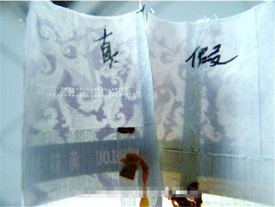 真品小盒正反面均采用具有黃色、紅色、紫色、藍色和綠色等干涉色的效果珠光油墨,在不同光線角度下會呈現出不同顏色,同時也具有能阻止掃描儀、電分機及彩色復印機的復制功能;假煙在不同光線角度無法呈現出彩色光線變化,因多采用高清掃描復制,其圖片多邊緣呈現顆粒粗大的網格狀,與真品材質存在顯著差異。