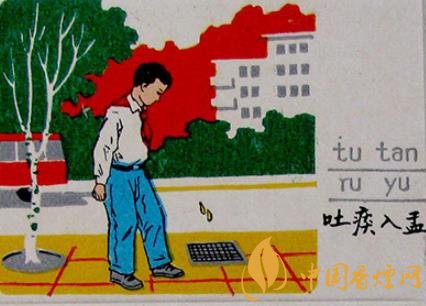 火花圖案采用宣傳畫的形式,人物形象生動逼真,色彩鮮艷明快,具有濃郁的生活氣息。如一枚主題為“吐痰入盂”的火花(圖2)上,一位穿白襯衫系紅領(lǐng)巾的小男孩正彎著腰,對準(zhǔn)人行道的一口窨井吐入一口痰。背標(biāo)除一枚“精神文明”紅色橢圓篆印外,另有“小小一口痰,細(xì)菌千千萬”的宣傳文字;還有一枚主題為“講衛(wèi)生”的火花上,一個(gè)揮舞著小紅旗的大爺,在綠樹成陰、高樓林立的繁華鬧市,正對一年輕家庭亂扔垃圾的行為進(jìn)行勸說教育,旁邊佩戴紅袖章的大媽打掃著他們隨手丟棄的雜物,小女孩則在一旁低頭認(rèn)錯(cuò)。副標(biāo)上“違章必罰”的紅色篆印十分醒目。通過小小的火柴,科學(xué)宣傳防疫知識,提高公眾自我保護(hù)意識,早宣傳,早預(yù)防,起到了事半功倍的作用。