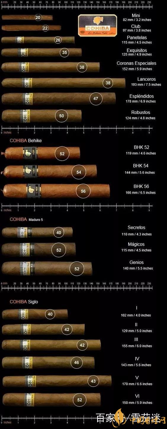 哈伯納斯旗下的 27 個古巴品牌雪茄,長度基本在 100mm-230mm 之間,環徑基本在 10.4-22.8 mm之間。