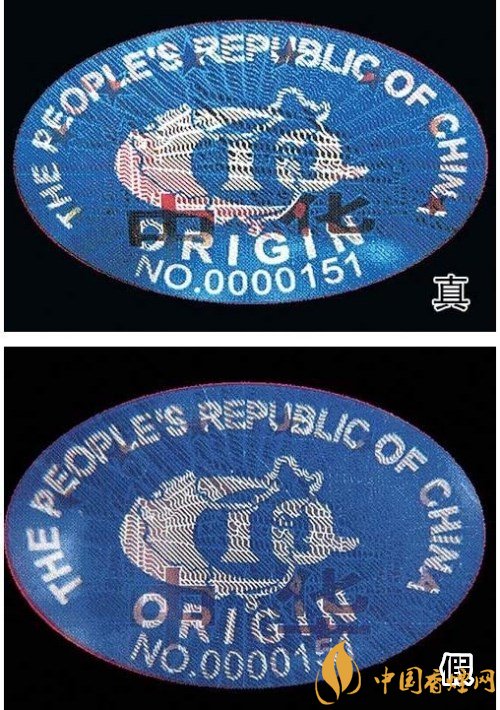 3、“中華”原產(chǎn)地標(biāo)志為藍(lán)色橢圓形,折光可見(jiàn)“中華”字樣、8顆“★”及天安門(mén)圖案。真煙色彩飽滿(mǎn),圖案清晰;假煙色彩暗淡,圖案模糊。