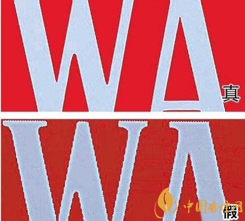 4、真煙白色字體邊緣規(guī)整光滑,字跡飽滿(mǎn);假煙白色字體邊緣粗糙,色彩污濁,有明顯鋸齒印。
