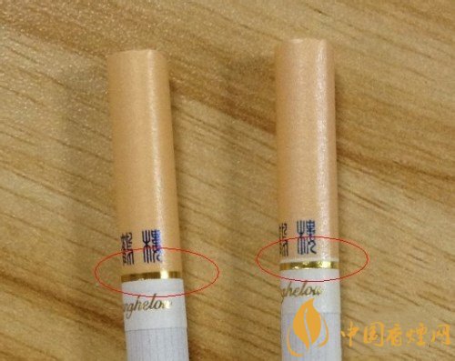 左邊真煙金色圓圈部位與煙嘴結合比較完美,毫無縫隙,而且色澤靚麗印刷不拖泥帶水,細看右邊的金色圓圈與煙嘴結合空隙較大,中間居然脫節了。而且光圈也比較粗糙。