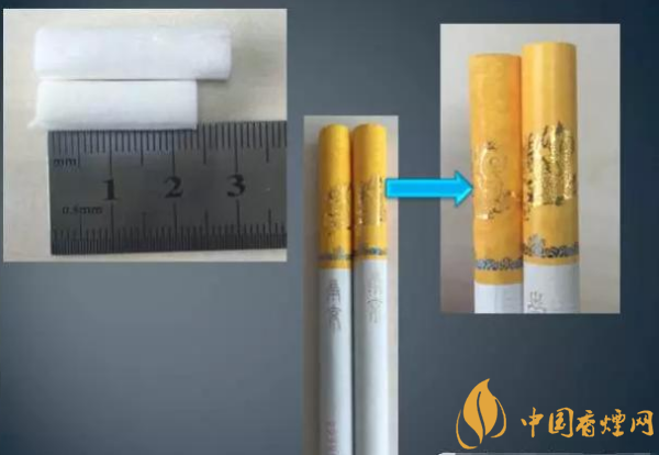 真品卷煙:接裝紙長(zhǎng)度30mm,印刷的“龍”身上的龍鱗非常清晰,金屬感強(qiáng),濾棒長(zhǎng)度24mm。