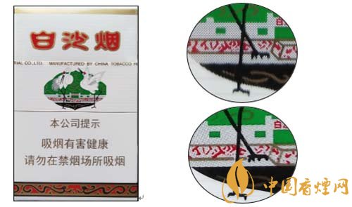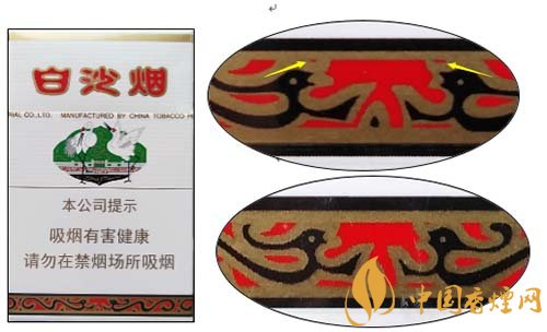 白沙(硬)因江南名泉式 ---“白沙古井”而得名,包裝以“白沙古井” 為背景,象征吉祥如意的雙鶴圖形為主體圖案。產品不斷應用新技術,科學配方,合理配香配料,口味特點:煙香濃馥、諧調,余味純正舒適。現就該卷煙小盒鑒別方法介紹如下: