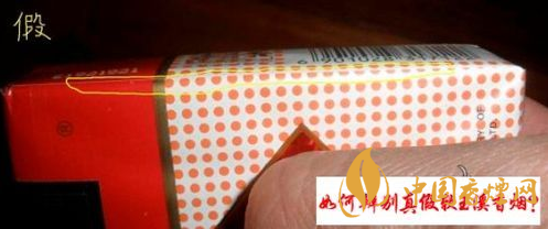 5這個圖片看拉線和頂部包裝處,真煙拉線有均勻的膠痕氣泡,假的平滑光潔,頂部口處,里面金色的包裝比外皮要高出一點,假的是一齊的。