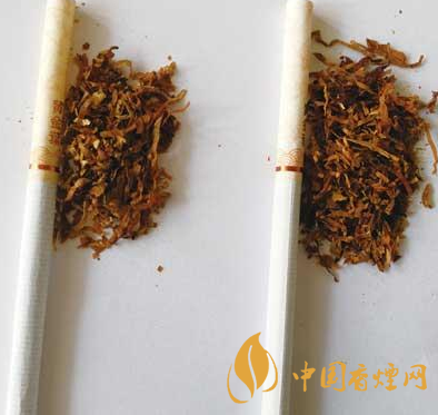 煙支及煙絲差異對比:真煙煙支的水松紙顏色偏黃,煙絲結構為純葉絲;假煙煙支水松紙顏色偏淡,煙絲結構為葉絲、造紙法再造煙葉,與真品特征存在明顯差異。