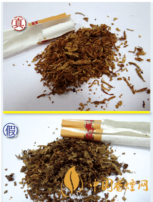 真品煙絲摻配均勻,采用獨特的“三烤”工藝,煙絲顏色呈現金黃色,煙絲彈性油潤性好;假煙煙絲摻雜摻假,煙梗煙末較多,煙絲未加膨化處理,煙絲碎屑多,與真品存在顯著差異。