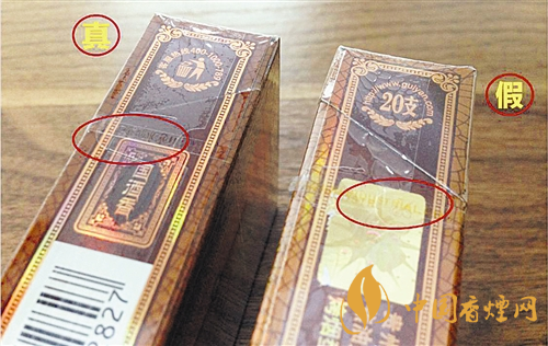 假冒:非常粗糙,方向錯位,位于煙盒的左側。