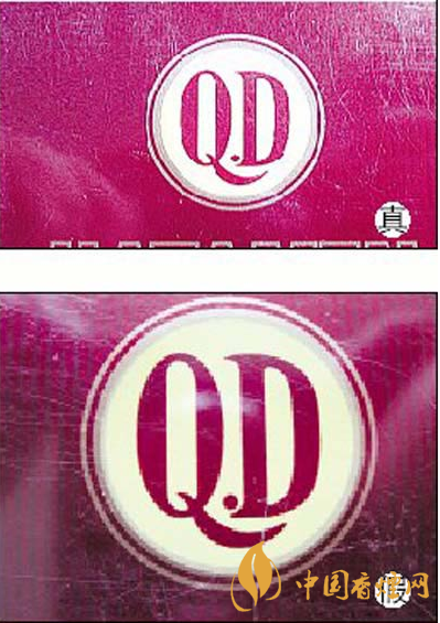 3.真品卷煙條盒和小盒正面QD處,用珠光黃油墨印刷,變換角度,QD處黃色部分由黃色轉變為淺黃色,假冒卷煙不變色。